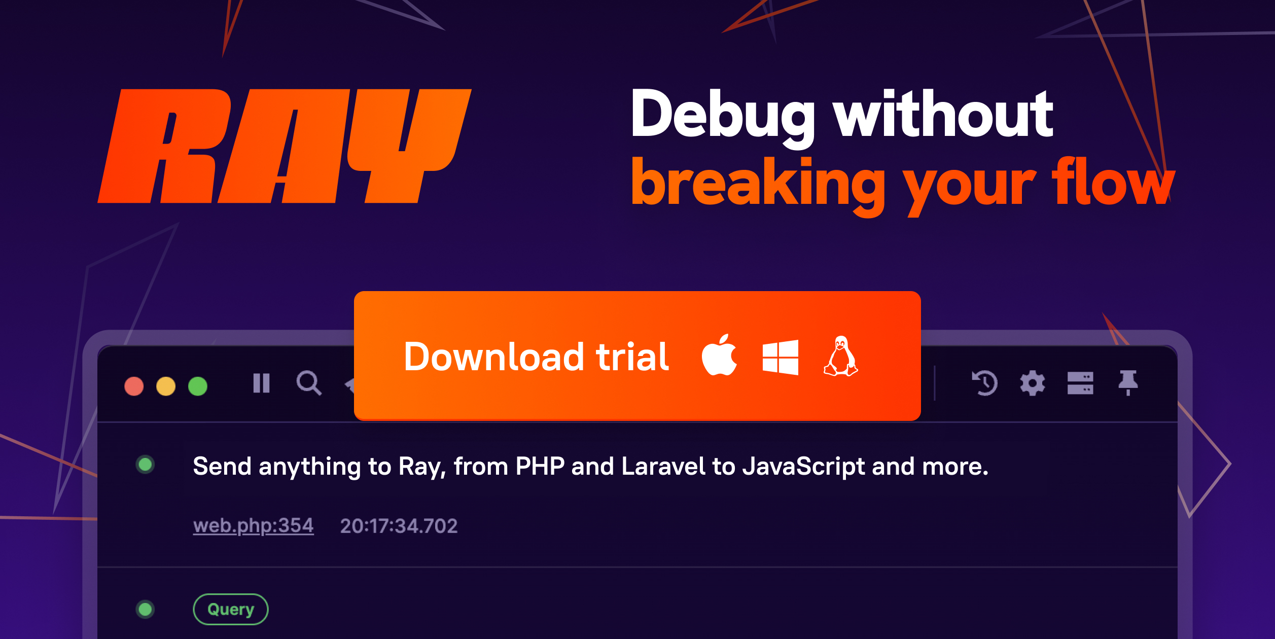Ray is a desktop debugging app that keeps the instant feedback you get from console.log() and dump() but lets you use the same debugging syntax across Laravel, PHP, JavaScript and more frameworks and languages.